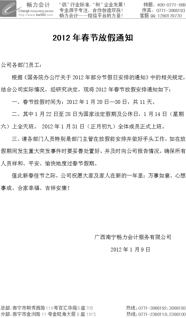 2012年春节放假通知