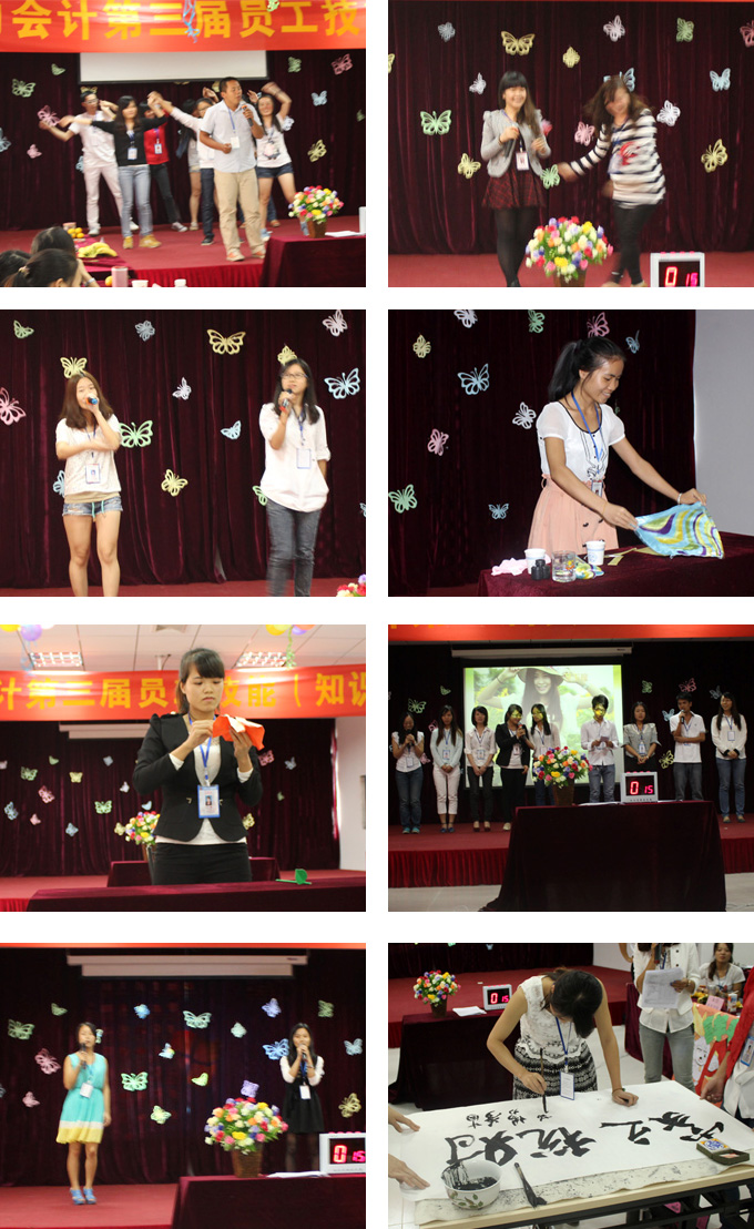 比赛时间从13点至18:00正式结束,这次比赛全员准备了近一个月,各组都利用下班时间进行才艺排练和背题,工作小组也在紧张有序的筹备工作。本次技能大赛题目主要由《公司法》、《会计法》、《最新税收政策》《内部财务制度》、《公司规章制度和企业文化》等综合知识组成。本次大赛共分为四个环节:车轮大战、情景模拟、现场主持+才艺表演、抢答题,每个环节都充满了挑战和欢乐。主持人组织大家齐唱国歌,公司黄义沛总经理为大家做赛前致词,鼓励全员积极地、快乐地比赛,把技能和实践进行完美的结合,并祝愿全员能取得优异成绩。主持人宣布比赛正式开始,8组队员分别在组长的引导下作了精彩的团队展示。首先进行车轮大战规则解读, H组首获擂主机会,优先挑选被挑战组,大家依次轮流答题,直到其中一组答错而被迫淘汰。其他组依次进行比赛,直至每组都挑战完毕,本轮游戏结束。本环节比赛结束时间比预期的有所提前,大家还处于一种紧张状态,大家都意犹未尽,跃跃欲试,没有能很好的发挥真实水平。