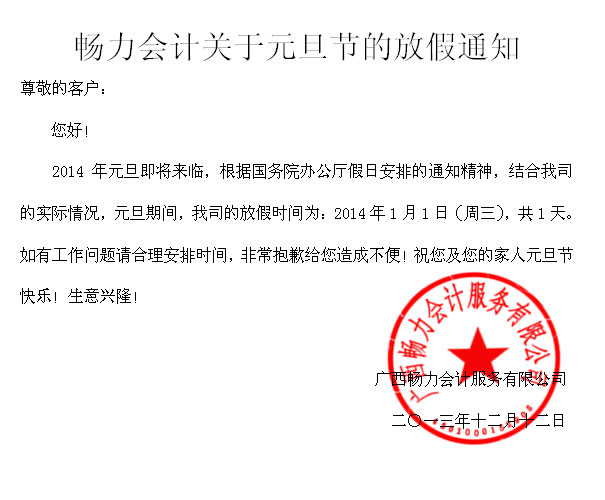 畅力会计关于2014年元旦节的放假通知