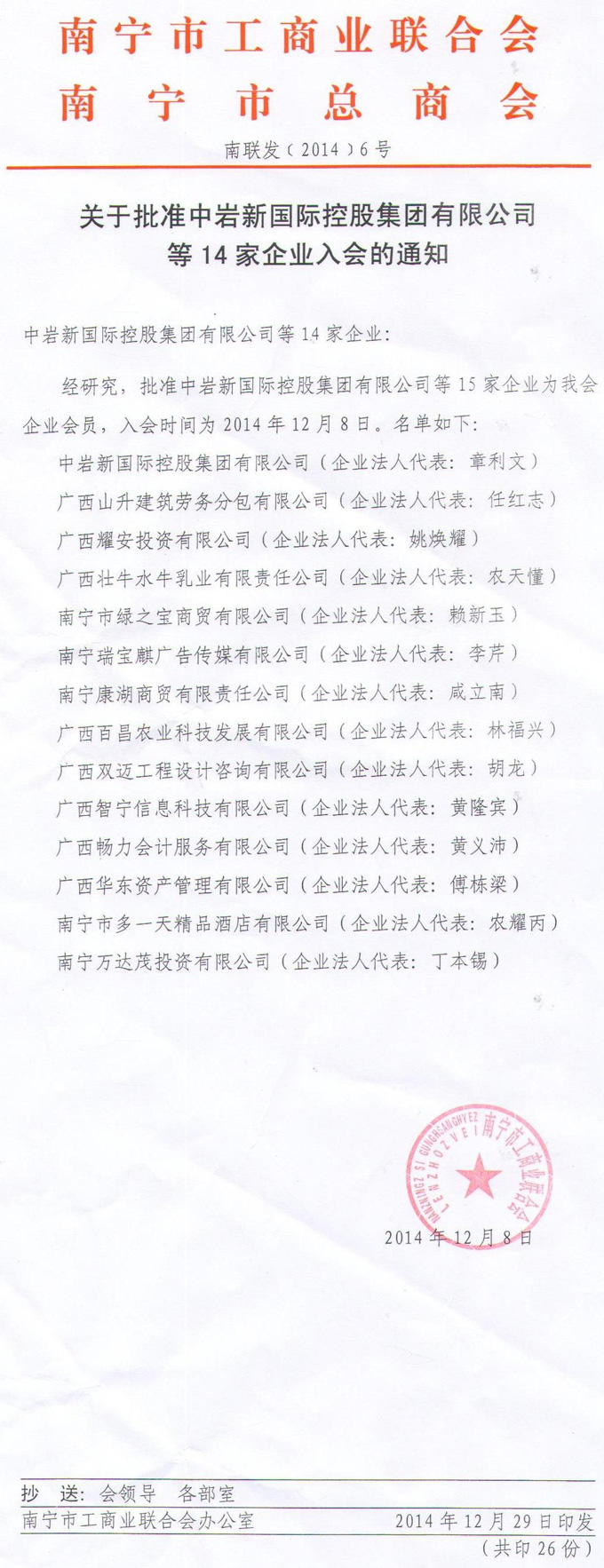 关于公司获批成为南宁市工商业联合会会员企业的通知