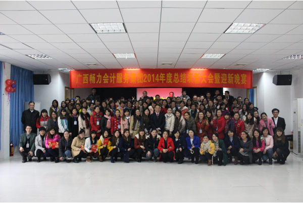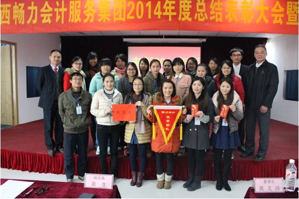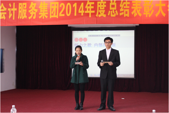 总结表彰大会环节一:由常务副总裁代表公司进行2014年总结性工作报告。常务副总裁指出,2014年是公司“二五规划”中的发展年。公司认真总结二次创业以来的成功经验、认真剖析存在问题,根据市场经营形势变化的要求,公司以员工的发展为主线,提出在经营管理方面进行改革调整、抓效益保收入的任务。2014年,全体员工积极担当,携手共创,奋力前行,促进公司业务经营有所发展,员工也逐步分享到公司改革、调整、发展的成果。2015年,经营管理上总的指导思想为:完善营运机制和激励机制,推广品牌、拓展布点、扩大规模,进一步规范各项业务提高服务质量,提高营收效益,确保持续、高效、稳定发展。2015年主要奋斗目标【1-3-1-3-3“四增一降” 】分别是:经营收入比2014年翻一番,服务客户达到3000家,在南宁市和广西区内开设新的分公司10家,员工薪酬福利比2014年增长30%,成本费用比例比2014年降低3% 。