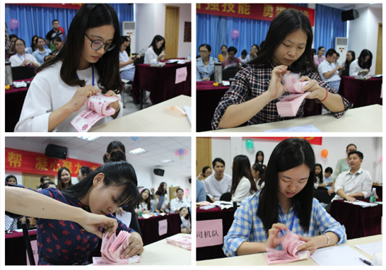 点钞比赛环节,在一分钟内点出最多的钞票并且确保清点的数量是正确的。