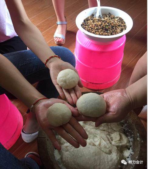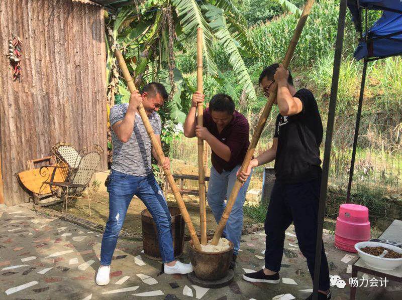 三大壮男在捣混糯米糍粑,真是卖力得不亦乐乎!