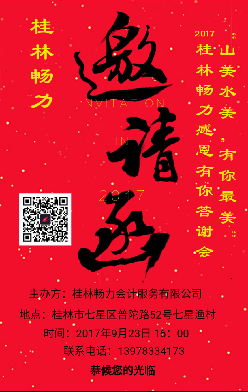 尊敬的客户 您好!桂林极致信息咨询有限公司在原有基础上重组升级为桂林畅力会计服务有限公司,成为畅力会计集团的一员。为感谢您的支持与信赖,桂林畅力于9月23日在七星渔村举办“感恩有你答谢会”现诚邀您的到来! 桂林畅力 时间:2017年9月23日16:00 地点:桂林市七星区普陀路52号七星渔村 人物:桂林畅力尊贵的客户 报名热线:13978334193 卢经理 事件:“山美水美,有你最美”2017桂林畅力感恩有你答谢会 美食美酒我们已经备好 赶紧拿起电话报名吧! 报名热线:13978334193 卢经理