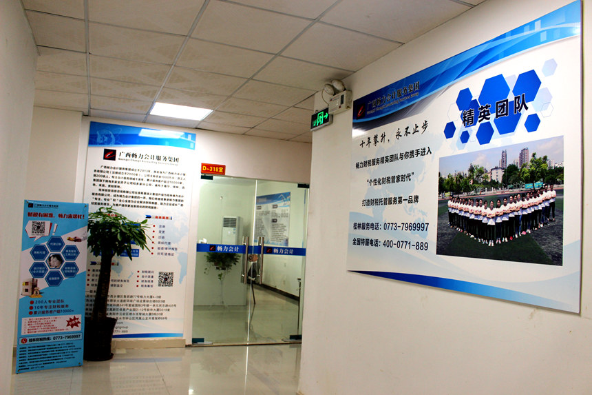 2017年9月23日中午十二点,畅力集团董事长黄义沛带领南宁总部的几个小伙伴来到了桂林七星区软件大厦——桂林畅力的所在地: 小伙伴们先来张美美的合影: 董事长参观了我们桂林畅力的办公室: 左为畅力集团董事长黄义沛 右为桂林畅力总经理卢集 先来看看我们桂林畅力的新面貌吧: 桂林畅力小伙伴合影: 三楼门口: 会议室: 营销办公室: 客户接待室: 代账办公室: 在桂林,需要注册公司、代理记账、注册商标就找我们吧! 联系电话:0773-7969997