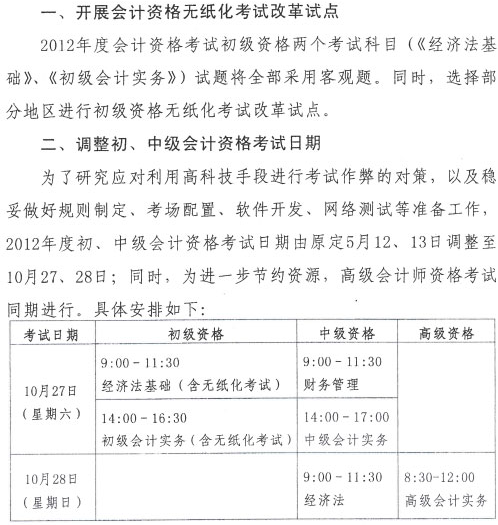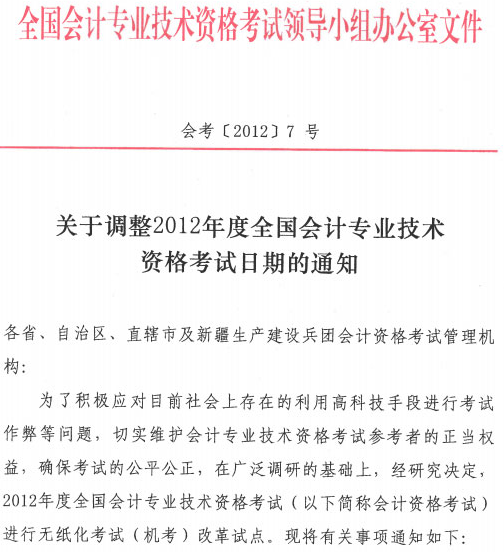 内容摘要:根据财政部、人力资源社会保障部全国会计专业技术资格考试领导小组办公室印发《关于调整2012年度全国会计专业技术资格考试日期的通知》(会考[2012]7号),决定2012年度全国会计专业技术资格考试(以下简称“会计资格考试”)进行无纸化(机考)改革试点,相应调整初、中级会计资格考试日期。2012年度初、中级会计资格考试日期由原定5月12、13日调整至10月27、28日。