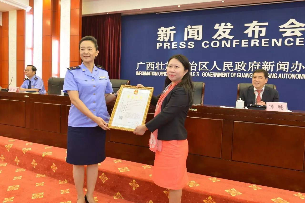 ▲2017年4月24日,广西壮族自治区工商局局长张虹给广西桂海鑫进出口代理有限公司法定代表人兼经理胡兴龙发放34证合一的“一照通”营业执照