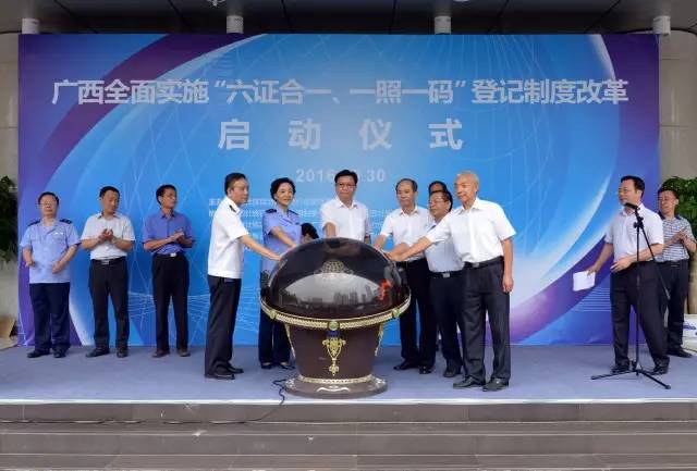12月,自治区政府办公厅印发《广西实施“先照后证”改革后加强事中事后监管工作方案的通知》,进一步深化我区商事制度改革,强化“先照后证”改革后的事中事后监管。 ▲2016年9月30日,自治区副主席黄日波宣布广西“六证合一、一照一码”登记制度改革正式启动,相关单位领导共同按下启动球