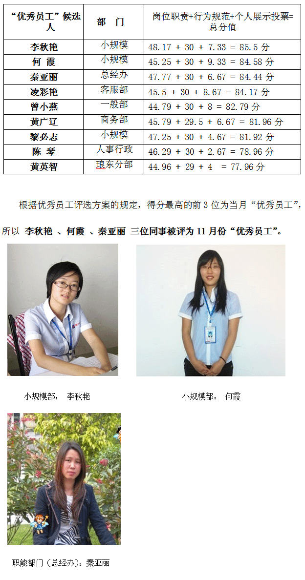 在总经办的组织和各部门的积极配合下,11月份优秀员工评选活动圆满结束,评比采取“部门无记名投票评选”候选人+“候选人演讲、展示”+全公司按部门人数比例抽取共30人进行现场投票+“评选委员会评分”的方式进行。 11月30日早上公司组织了共30位人员在503大厅举行现场投票,9位候选人分别上台演讲、展示,然后大家进行不记名投票。大会结束后,8位大众评选委员会(黄捷斐、吕颜、伍尚玉、陆练华、唐雪艳、韦灵燕、黄雪芬、唐艳静)在706会议室进行公开唱票,得出得票分值;同时评选委员会对9位候选人进行现场评分,并参与和监督计算出最后总分数,现将9位候选人成绩公布如下: