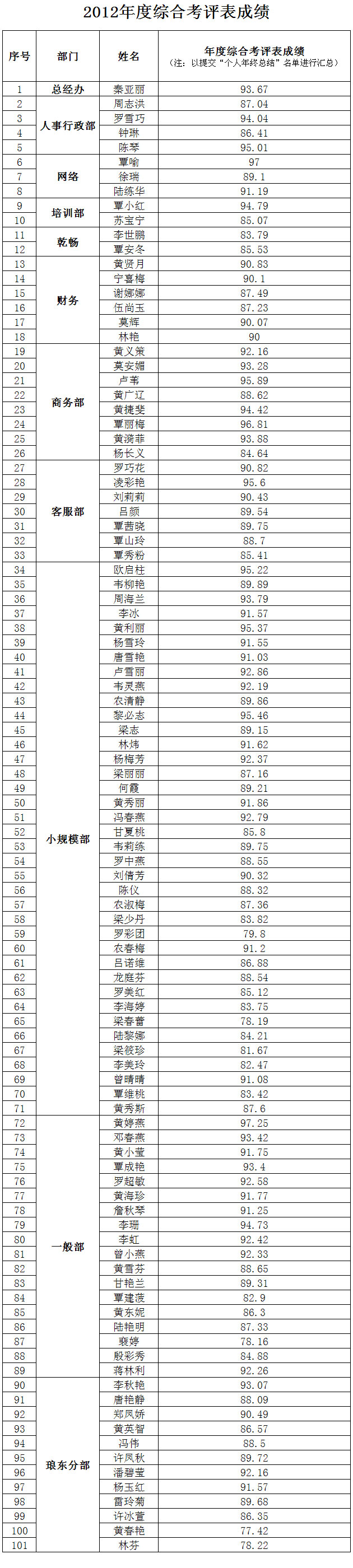 2012年度综合考评表成绩