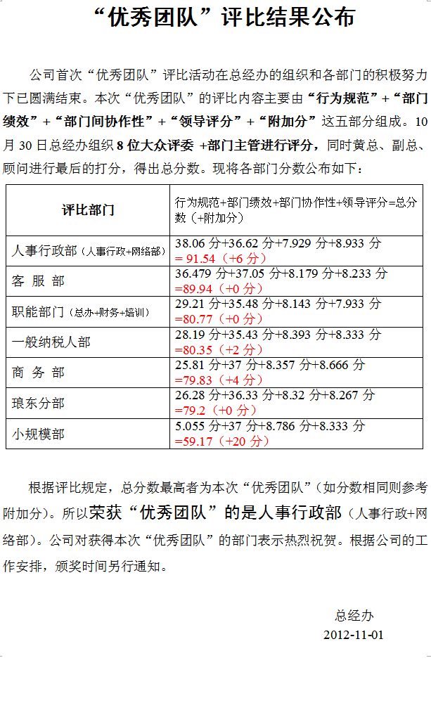 “优秀团队”评比结果公布