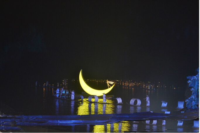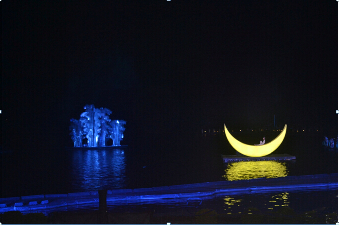 水上哦,真人实景,灯光效果很不错,整个设计也很美,现场看很有意境的,只是相机不给力,努力努力,买台更好的单反