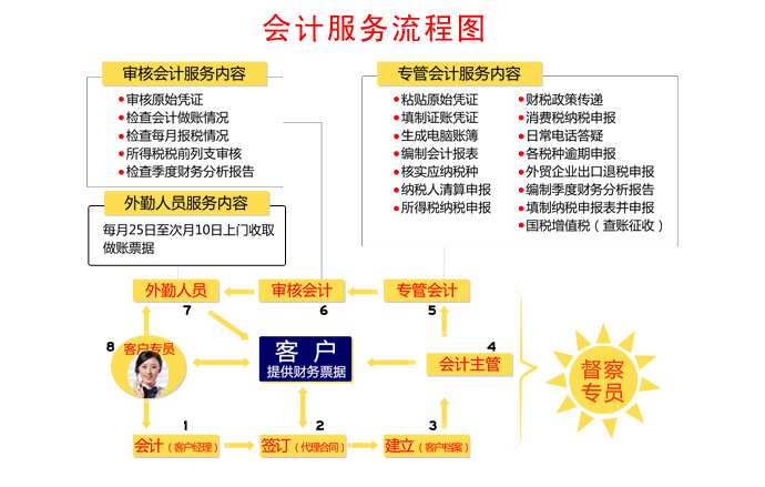 1.上门收取票据 2.进项认证 3.纳税申报 4.账务处理 5.上传会计报表 6.年度企业所得税汇算清缴 7.协助企业与税局工作的沟通衔接 增值服务: 1.企业税局报到(企业信息采集) 2.一般纳税人资格认定 3.代理申请、购买发票 4.指导发票开具 5.税收政策传递 6.审查纳税情况,用足税务优惠政策,选择纳税最佳方案;