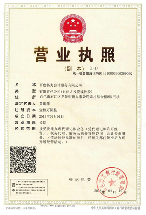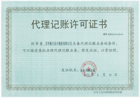 百色畅力会计服务有限公司成立于2013年,公司注册资金100万元,是广西畅力会计服务集团旗下的全资子公司,经百色市财政局批准颁发“代理记账许可证书”、在百色市工商局注册成立的会计服务有限公司,是百色市首家、目前最大的专业会计服务公司。现拥有一批精干的管理人员和一支高素质的专业技术队伍,专注财税服务4年,服务百色企业客户超过500家。百色畅力会计服务有限公司立志于全产业链服务企业客户,打造“企业财税新管家时代”。