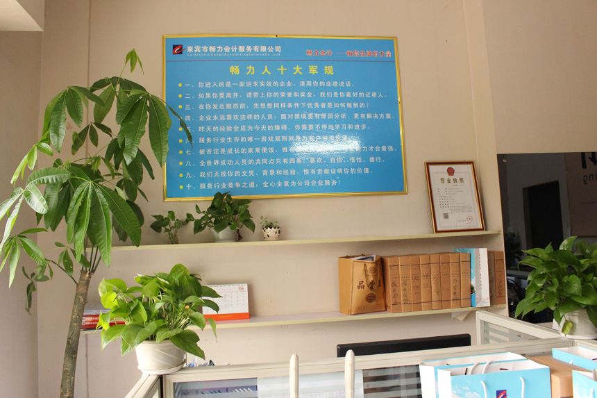 来宾市畅力会计服务有限公司成立于2015年4月28日,是经来宾市兴宾区财政局审核颁发 “代理记账许可证书”的合法专业代理记账机构,经来宾市工商行政管理局注册成立的专业会计服务公司,是南宁畅力旗下的唯一一家位于来宾的子公司,公司地址位于来宾市盘古大道西130号、富城国际A区(市政府对面)。干净,整洁,舒适的办公环境,优越的地理位置,便利的交通助力于来宾畅力会计服务公司更好的为客户服务。我们立志于全方位服务于企业,打造“企业财税管家时代”。 公司经营范围有:代理记账、商务代理、财务管理、旧账清理、财税规划、电子商务等优质品牌服务。 公司地址:来宾市盘古大道西130号、富城国际A区(市政府对面)。 联系电话:0772—5318730 0772—5318735
